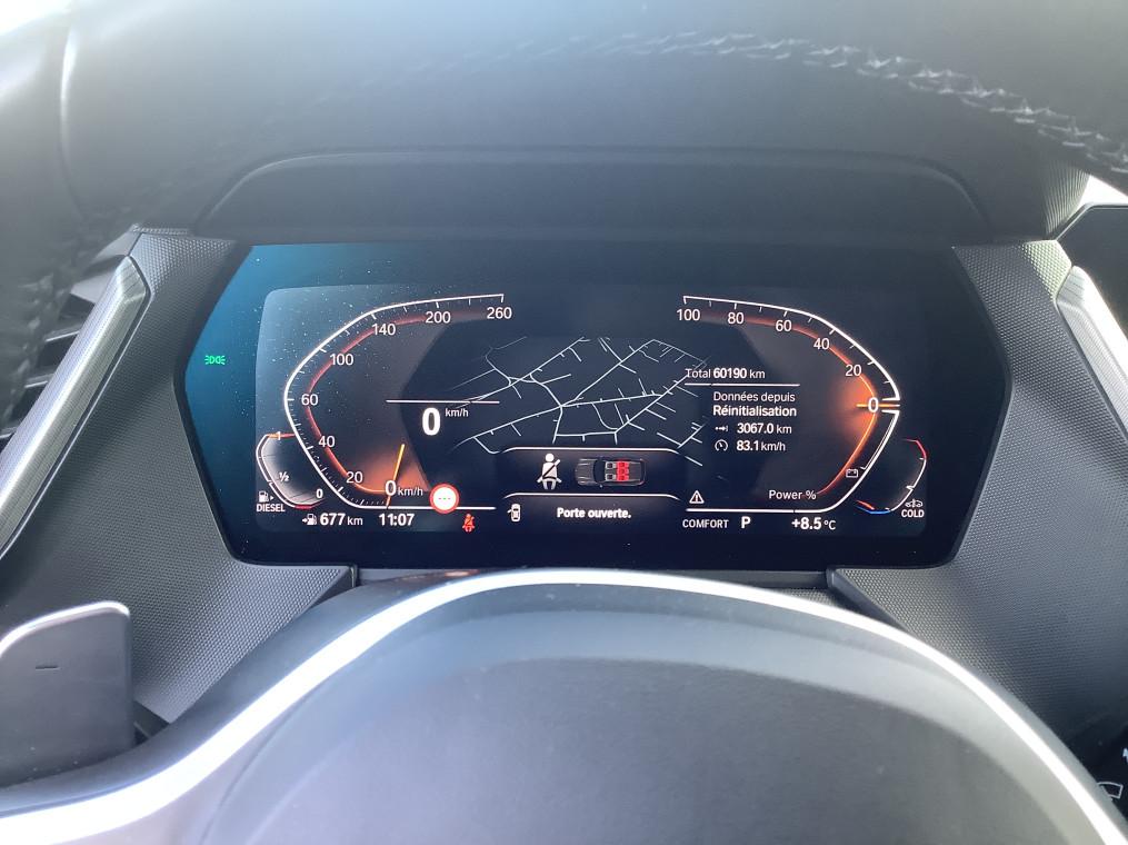 Boite de vitesses automatique Sport 8 rapports avec palettes au volant - 150 €, Hotspot Wi-Fi - 0 €, Pack Evasion : Vitrage calorifuge, Park Assist, Toit ouvrant panoramique en verre, Banquette AR rabattable 40/20/40 avec trappe a ski - 1 350 €, Pack Innovation : Climatisation automatique bi-zone, Connectivite avancee sans fil avec recharge par induction, Pack Advanced Full LED, Acces confort avec preparation "BMW Digital Key", Retroviseurs exterieurs rabattables electriquement, interieur et exterieur gauche electrochrome, Sieges AV electriques avec memoire conducteur et passager, Affichage Tete Haute HUD Couleur, Feux de route permanents anti-eblouissement - 3 250 €, Pack Projecteurs Advanced Full LED : Eclairage d'intersection a LED, Feux de route permanents anti-eblouissement, Eclairage avec technologie a LED logees dans les anneaux lumineux en 3D des projecteurs pour feux de, Projecteurs directionnels avec repartiition variable de la lumiere selon la vitesse - 610 €, Regulateur de vitesse actif ACC + avec fonction Stop&Go - 460 €, Retroviseur interieur electrochrome - 180 €, Teinte de carrosserie métallisée Skyscraper Grau - 890 €