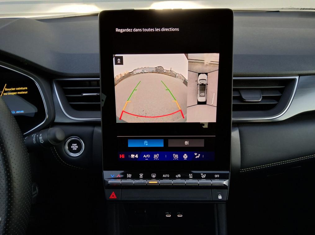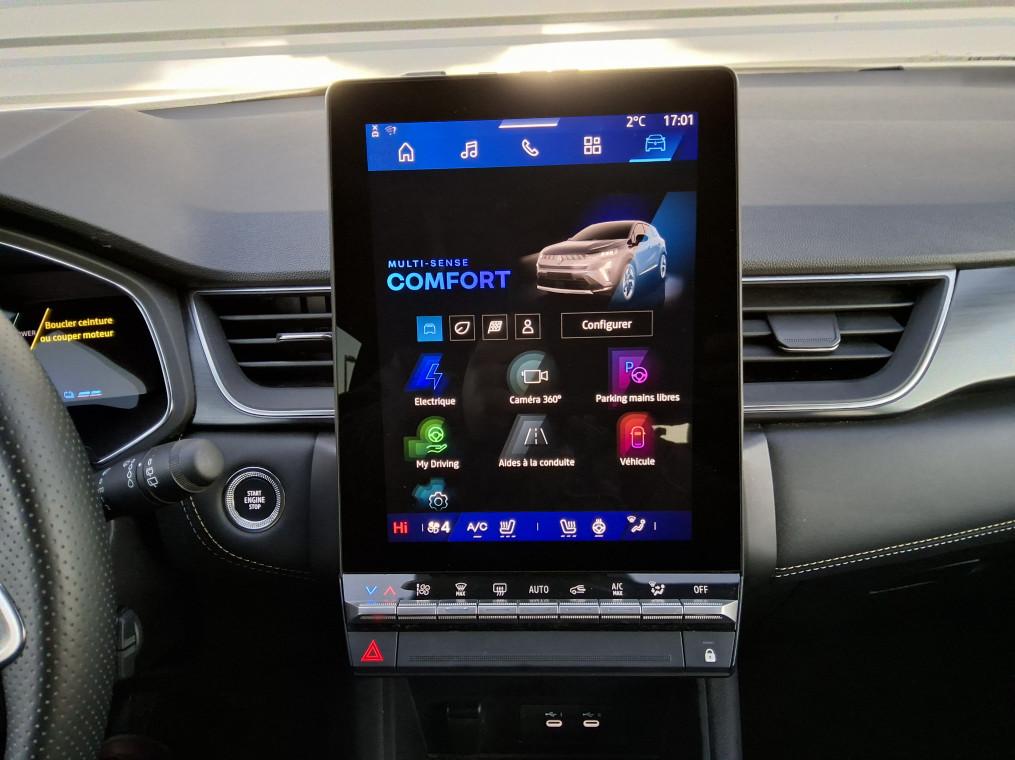 Aide au freinage d'urgence (A.F.U.), Airbag passager deconnectable, Airbags frontaux conducteur et passager adaptatif, Airbags lateraux AV, Alerte de distance de securite, Alerte detection de fatigue, Alerte franchissement de ligne et assistant maintien dans la voie, Alerte sortie securisee des occupants, Allumage automatique des essuie-glaces, Antenne Requin, Antiblocage des roues ABS, Appel d'urgence, Appuie-tetes AR, Avertisseur d'angle mort et detection AR avec centrage dans la voie, Avertisseur de sortie de stationnement en marche AR avec freinage d'urgence automatique, Banquette AR coulissante et rabattable 1/3 - 2/3, Boitier connect AIVC, Camera 3D vision 360°, Carte "Mains libres", Cartographie Standard, Ceinture centrale AR 3 points, Chargeur smartphone a induction, Climatisation automatique, Compartiment de coffre, Condamnation centralisee des portes, Conduite hybride predictive, Eclairage AV et AR Full LED Pure Vision, Feux AR 3D, Feux AR avec signature lumineuse Y, Feux de stop a LED, Filtre a particules, Frein de parking electrique avec fonction Auto-Hold, Hayon motorise mains libres, Indicateur de changement de vitesse, Jantes alliage 19'' diamantees Pulsar, Kit de gonflage, Leve-vitres AV electriques a impulsion, Lunette AR chauffante, Miroirs de courtoisie retroeclaires, My Safety switch, Notice d'utilisation digitale embarque dans le systeme multimedia du vehicule, Parking mains-libres, Poignees de portes ton caisse, Reconnaissance des panneaux de signalisation, Regulateur de vitesse adaptatif, Regulateur de vitesse adaptatif + centrage dans la voie, Renault Multi-sense, Repetiteurs lateraux de changement de direction, Retroviseur interieur chrome frameless, Retroviseurs exterieurs degivrants, reglables et rabattables electriquement, Sellerie Ionic, Sieges AV a reglage electrique 6 voies et conducteur reglage manuel lombaire, Sieges AV chauffants, Systeme de controle de trajectoire ESC avec aide au demarrage en cote, Systeme de freinage d'urgence avance, Systeme de surveillance de la pression des pneus, Systeme ISOFIX (i-Size) aux places laterales AR et passager AV, Systeme multimedia openR link 10.4" avecGoogle integre, Tableau de bord avec ecran numerique et personnalisable 10", Temoin d'oubli de ceinture de securite, Vitres laterales et AR surteintees, Volant chauffant, Volant tep