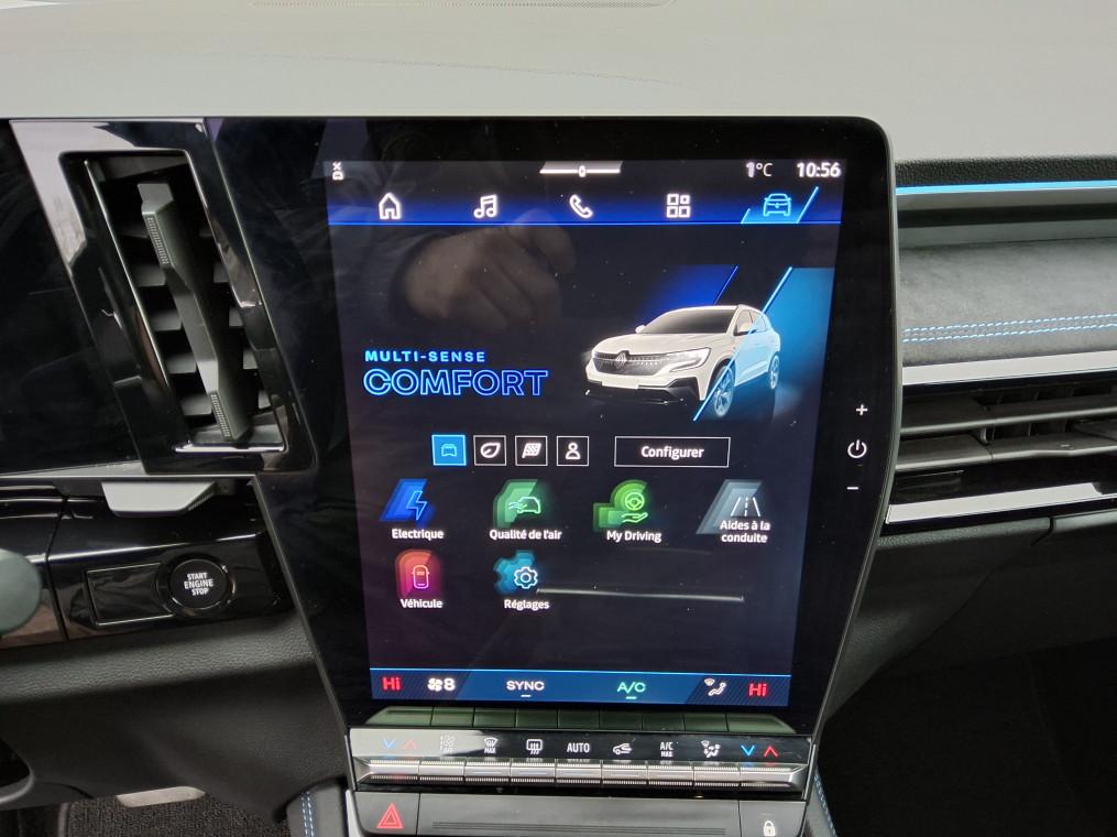 2 prises USB a l'AV et a l'AR, ABS avec aide au freinage d'urgence, Aide au freinage d'urgence, Aide au parking AV/AR et lateral, Airbags frontaux (conducteur et passager), Airbags lateraux bassin / thorax conducteur et passager AV, Airbags lateraux, milieu AV et rideaux, Alerte de distance de securite, Alerte detection de fatigue, Alerte franchissement de ligne et assistant maintien dans la voie, Appel d'urgence, Appuis-tete AV reglables, Banquette AR 1/3 2/3, Barres de toit longitudinales, Boite de vitesse automatique 4 rapports, Camera de recul, Carte Renault acces et demarrage mains libres, Chargeur smartphone a induction, Ciel de toit gris anthracite, Clignotants AR dynamiques, Climatisation automatique bi-zone, Commutation automatique des feux de route/croisement, Console centrale avec repose main coulissant, Controle dynamique de trajectoire ESC avec ASR, Detection intelligente des limitations de vitesse et prevention survitesse, Faux plancher de coffre, Feux AR a LED avec effet 3D, Feux AV full LED Adaptative Vision, Feux de jour a LED, Frein de parking electrique avec fonction Auto-Hold, Jantes alliage 20" Daytona diamantees noir, Kit de gonflage, Leve-vitres AR electriques a impulsion, Leve-vitres AV electriques a impulsion, Lumiere d'ambiance personnalisable, Miroir de surveillance enfants, Multi-sense, My Safety switch, Navigation Google Maps, Pack Design esprit Alpine exterieur, Pack Design esprit Alpine interieur, Palettes au volant, Pre-equipement alarme, Predisposition ethylotest, Regulateur de vitesse adaptatif, Retroviseur interieur electrochrome sans cadre, Retroviseurs exterieurs electriques, degivrants, rabattables automatiquement, Sellerie mixte tissu carbone / alcantara avec surpiqures bleues, Seuil de portes, Siege conducteur et passager avec reglage en hauteur, Sieges avec systeme ISOFIX, Systeme de surveillance de la pression des pneus, Systeme Multimedia openR link 12" : navigation, services Google, audio Arkamys Auditorium, Tableau de bord full numerique 12,3'', Verrouillage centralisee, Vitres AR surteintees, Volant reglable en hauteur et profondeur