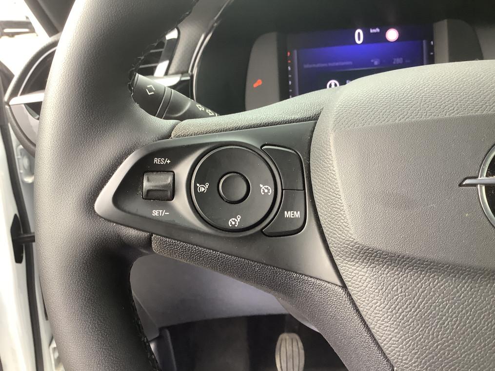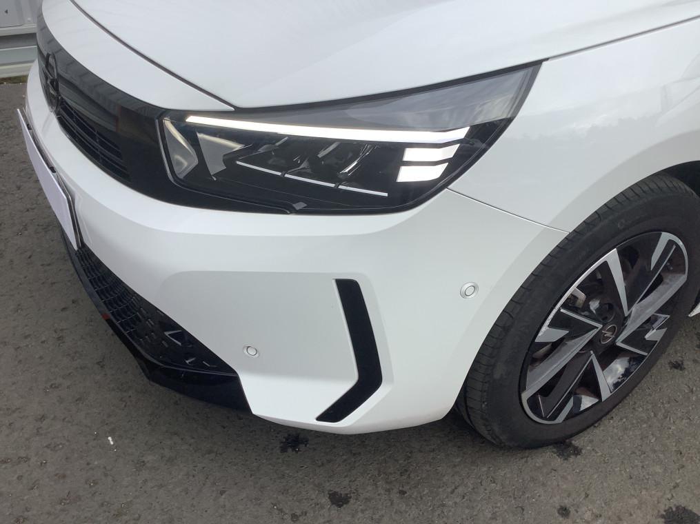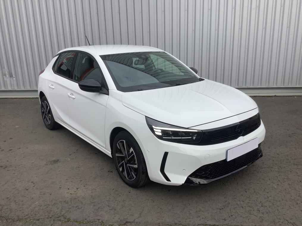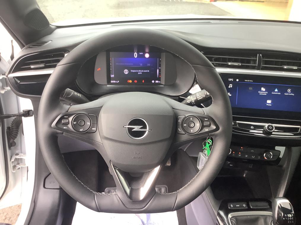 1 cle a telecommande et seconde cle rigide, 1 prise USB type C a l'AV, 4 HP, 5 appuis-tete reglables en hauteur, ABS, ESP, TCS, Aide au stationnement AR, Aide au stationnement AV, Aide au stationnement AV/AR, Airbags frontaux et lateraux conducteur et passager AV, rideaux, Alerte d'angle mort, Alerte de sous-gonflage des pneumatiques, Allumage automatique des feux de croisement, Apple CarPlay et Android Auto sans fil, Banquette AR rabattable 2/3-1/3, Boite manuelle 6 rapports, Calandre Opel Vizor, Camera de recul analogique 130° panoramique, Camera de recul panoramique, Chassis de type sport, Ciel de pavillon noir, Climatisation manuelle, Combine d'instrumentation numerique 7", Console centrale avec porte-gobelets, accoudoir central et espace de rangement, Controle de pression des pneus, Controle electronique de stabilite (ESP), Coquilles de retroviseurs peintes en noir, Decor interieur Noir avec inserts blanc, Decors interieurs avec inserts - Noir/Gris, Detection de non-bouclage des ceintures de securite aux places AV, Direction assistee electrique, Ecran tactile 10" couleur compatible Apple CarPlay/Android Auto sans fil, Fixations Isofix sieges enfants aux places AR laterales, Fonction Bluetooth (appels et streaming audio), Frein a main mecanique, Grille inferieure en nid d'abeilles peinte - Noir, Jantes alliage 16" - Diamante, Jantes alliage 17" - Diamante, Kit anti-crevaison, Lettrage et logo - Noir, Ligne de vitrage noire, Module Opel Connect, Pack Securite avancee, Pack Visibilite LED, Pare-choc AR type sport, Pare-soleils avec miroir de courtoisie cote passager, Peinture bi-ton avec Toit Noir Karbon, Phares AR a LED, Phares AV Eco Full LED, Poignees de portes interieures chromees, Radio FM/AM/DAB+, Retroviseurs exterieurs rabattables electriquement, Retroviseurs exterieurs reglables electriquement, Sellerie Tissu Banda - Noir/Blanc, Siege conducteur reglable dans 6 directions, Siege passager AV reglable dans 4 positions, Sieges AV type sport, Signature lumineuse en forme d'aile a LED, Sortie d'echappement chromee selon moteurs, Spoiler AR, Systeme de freinage avec antiblocage des roues (ABS), Verrouillage automatique de la trappe a essence lors de la fermeture du vehicule, Verrouillage centralise avec telecommande et en roulant, Vitres AV et AR electriques - systeme anti-pincement, Volant 3 branches TEP Vegan, Volant reglable en hauteur et en profondeur