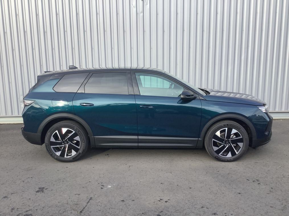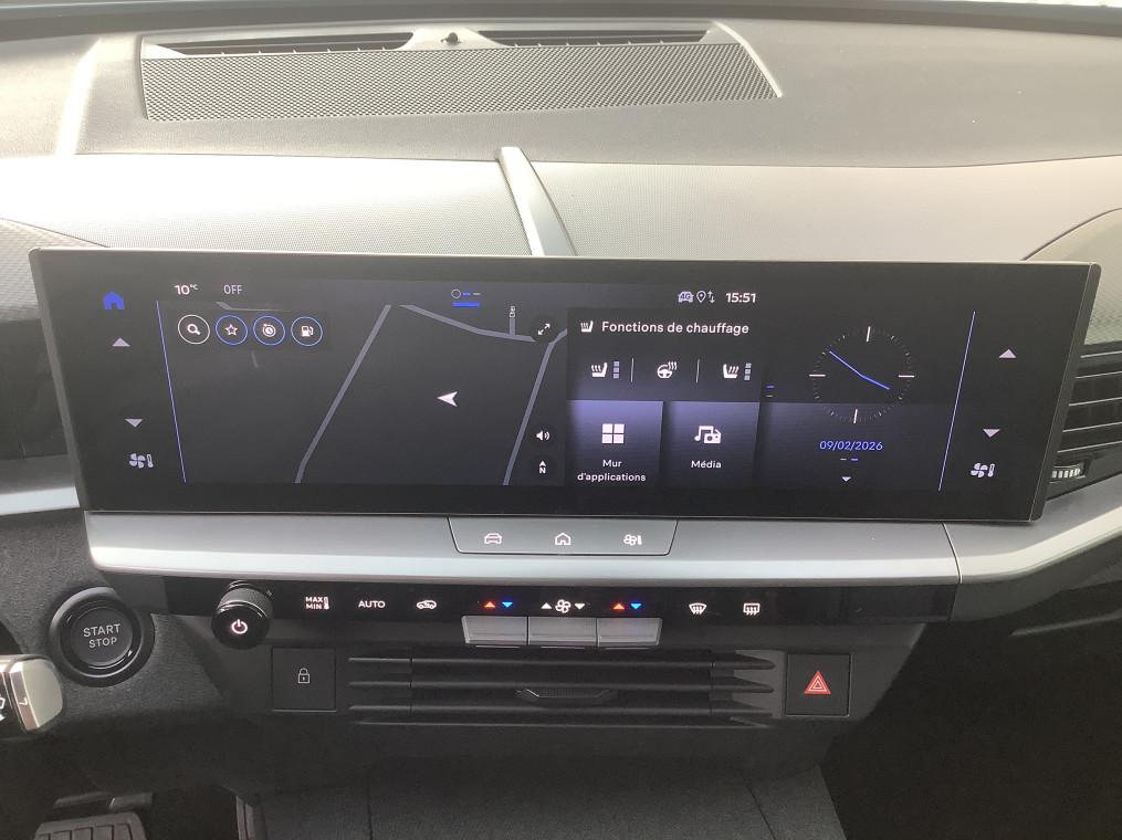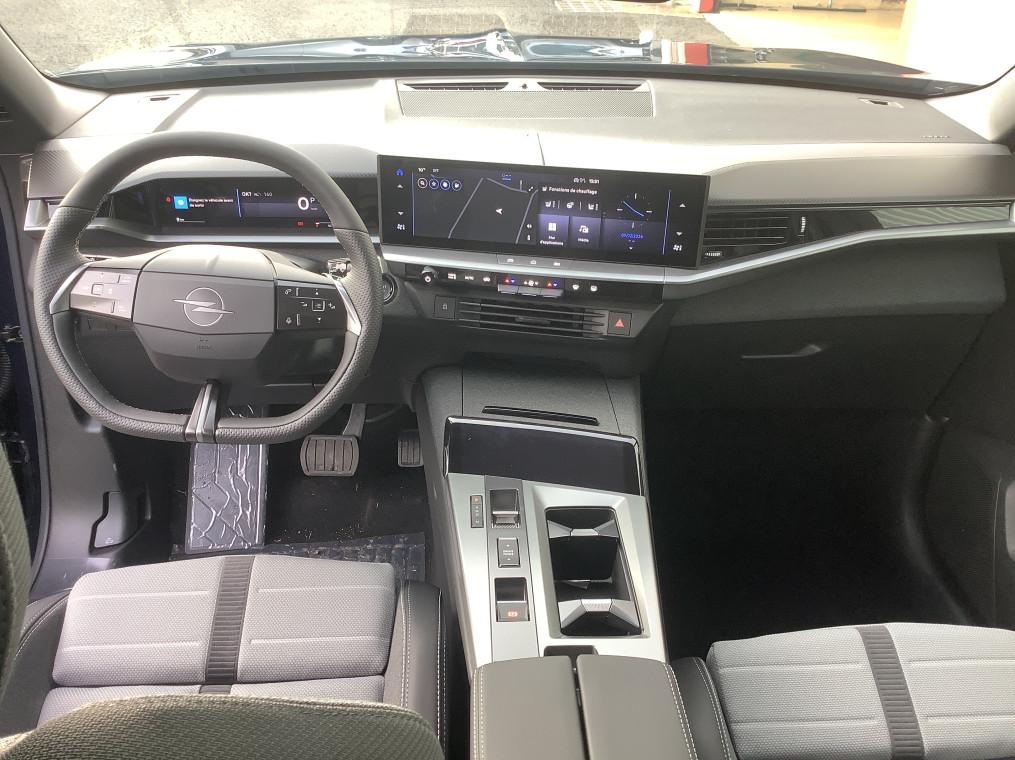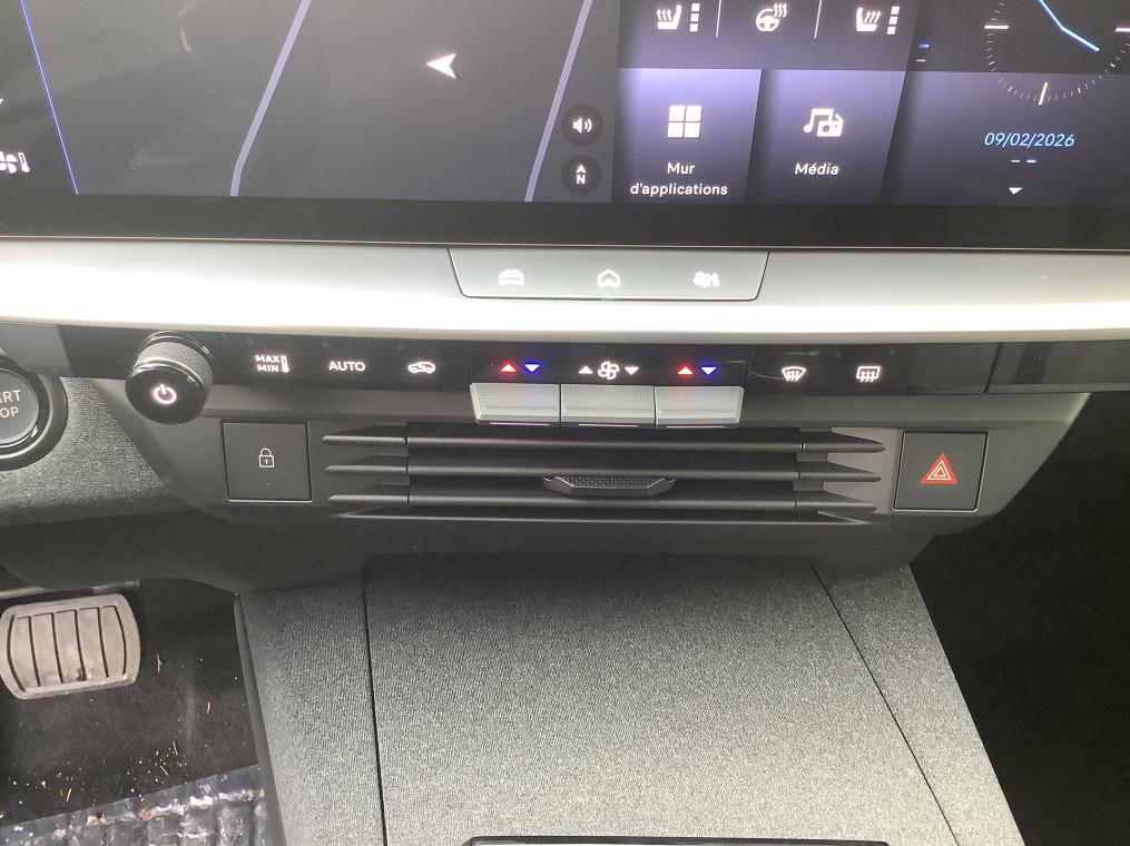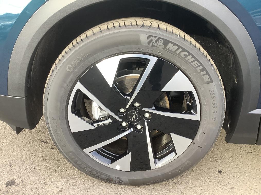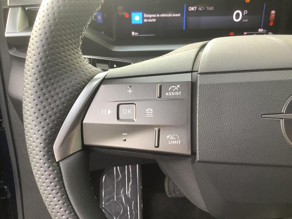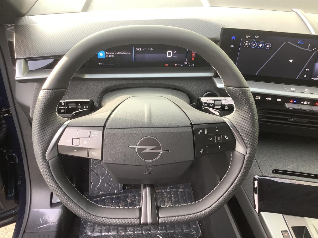 1 port USB-C AV, 2 cles a telecommandes 3 boutons (verrouillage, coffre, deverrouillage), 3 prises 12V (AV/AR et coffre), 5 appuis-tete reglables en hauteur, 6 HP, Accoudoir central AV/AR, Aide au stationnement AV/AR, Air conditionne automatique bi-zone avec filtre a polen et aerateurs AV/AR, Airbags frontaux et lateraux conducteur et passager AV, rideaux (6 airbags), Alerte de sous-gonflage des pneumatiques, Apple CarPlay et Android Auto sans fil, Appuis tete AV reglables sur 4 voies, Banquette AR avec dossier rabattable 40/20/40, Bluetooth 2 canaux, Boite a gants refrigeree, Boite automate sequentielle 6 rapports, Calandre Opel Vizor 3D ilumine, Camera de recul 180° avec buse de nettoyage, Ceintures de securite a pretension pyrotechnique, Console centrale avec porte gobelet, Console centrale Pixel Box, Controle de traction electronique (TCS), Controle electronique de stabilite (ESP), Coque de retroviseurs exterieurs noires, Decor interieur - Carbon Metal, Decors exterieurs Noir Laque, Detection de non-bouclage des ceintures de securite aux places AV/AR, Direction assistee, Eclairage d'ambiance personalisable Edge Light, Ecran d'instrumentation digitale de 10", Ecran infotainment de 16" avec Navigation, Entree et demarrage sans cle, Fixations Isofix et Top Tether aux places laterales AR, Frein de parking electrique, Jantes alliage 19" Diamante, pneus 225/55 R19, Kit anti-crevaison, Miroirs de courtoisie eclaires a LED, Opel Connect (BTA) avec e-call / b-call, Pack Drive Assist, Pack Visibilite, Pare-brise feuillete acoustique, Pare-soleils avec miroir de courtoisie conducteur et passager AV, Peinture bi-ton avec toit et spoiler AR - Noir Karbon, Peinture metallisee, Phares Matrix IntelliLux LED Pixel HD, Plancher de coffre modulable 2 positions, Poches AR specifiques smartphone, Radio FM & AM bi-tuner DAB+ (Digital Audio Broadcasting), Recharge smartphones sans fil (15W), Reglages lombaires pneumatiques, Retroviseurs exterieurs chauffants et reglables electriquement, Sellerie mixte Tissu / TEP Bird Light - Dominante Gris, Siege passager avec fixations ISOFIX, Sieges AV AGR et chauffants, Sieges AV ergonomiques reglables manuellement sur 10 voies, Sigle Opel AR 3D illumine, Signature lumineuse 3D avec technologie Edge Light, Spoiler AR, Systeme de freinage avec antiblocage des roues (ABS), Verrouillage centralise avec telecommande et en roulant, Vitres AR surteintees, Vitres AV/AR electriques avec systeme anti-pincement, Volant reglable en hauteur et en profondeur, Volant TEP chauffant
