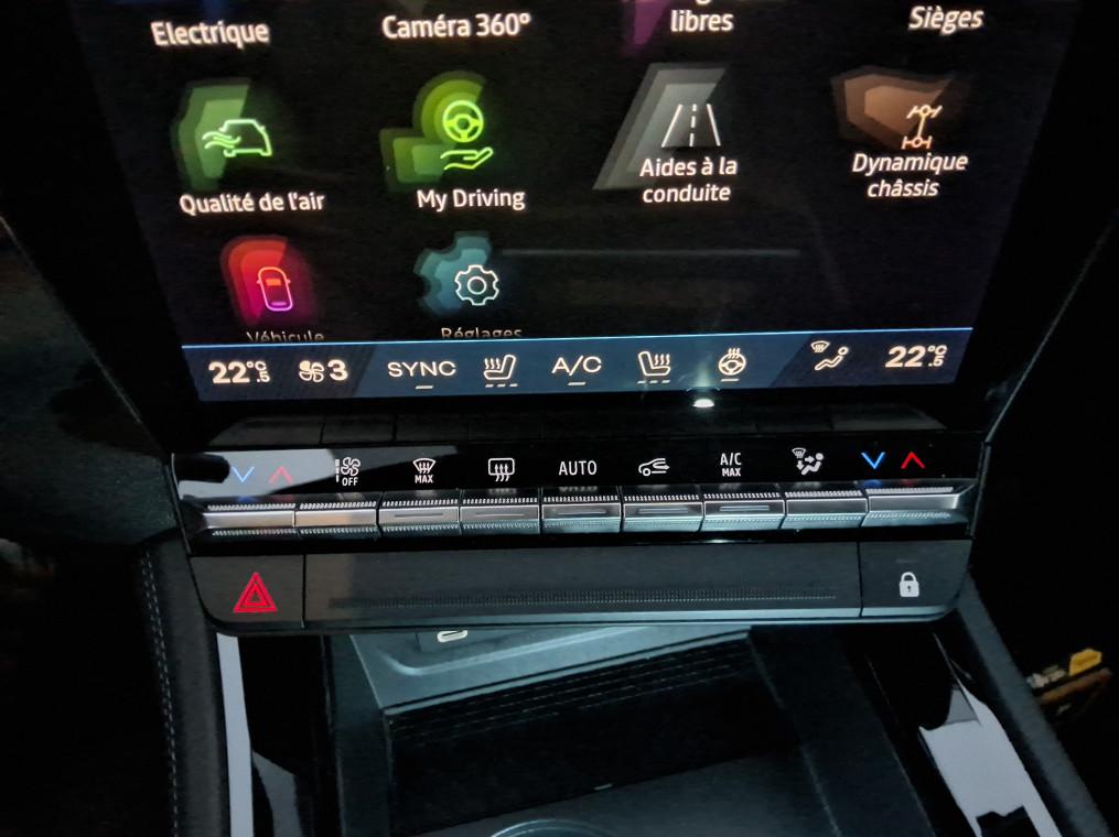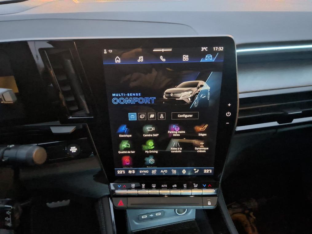 4Control advanced, ABS avec aide au freinage d'urgence, Aide au freinage d'urgence, Aide au parking AV/AR et lateral, Airbags frontaux (conducteur et passager), Airbags lateraux bassin / thorax conducteur et passager AV, Airbags lateraux, rideaux et central AV, Alerte de distance de securite, Alerte franchissement de ligne et assistant maintien dans la voie, Alerte sortie securisee des occupants, Appel d'urgence, Avertisseur d'angle mort et prevention sortie de voie en cas de depassement, Avertisseur de sortie de stationnement en marche AR avec freinage d'urgence automatique, Boite de vitesse hybride multimode 6 rapports, Carte Renault acces et demarrage mains libres, Chargeur smartphone a induction, Ciel de toit gris anthracite, Clignotants AR dynamiques, Climatisation automatique bi-zone, Commutation automatique des feux de route/croisement, Console centrale avec repose main coulissant, Console de toit avec porte-lunettes, Controle de la traction (TCS), Feux AV adaptive LED vision, Frein de parking electrique, Hayon motorise, Jantes alliage 20'' castellet noires diamantees, Kit de gonflage, Leve-vitres AR electriques a impulsion, Leve-vitres AV electriques a impulsion, Lumiere d'ambiance personnalisable, Maintenance connectee, incluse pendant 8 ans, Miroir de surveillance enfants, Mise a jour systeme (via firmware over the air FOTA), inclus pendant 5 ans, Multi-sense, Navigation Google Maps, Notice d'utilisation digitale embarque dans le systeme multimedia du vehicule, Pack connected driving, inclus pendant 5 ans, Pack controle a distance (via lapplication My Renault), inclus pendant 5 ans, Pack Design esprit Alpine exterieur, Pack Design esprit Alpine interieur, Palettes au volant, Plaque de protection de coffre en aluminium, Regulateur de vitesse adaptatif, Retroviseur interieur electrochrome sans cadre, Retroviseurs exterieurs electriques, degivrants, rabattables automatiquement, Sellerie mixte Alcantara avec surpiqures bleues et logo Alpine lumineux, Siege conducteur et passager avec reglage en hauteur, Sieges AV chauffants, Sieges avec systeme ISOFIX, Systeme de controle de trajectoire ESC, Systeme de surveillance de la pression des pneus, Systeme Multimedia openR link 12" : navigation & services Google integres, audio Arkamys Auditorium, Tableau de bord full numerique 12,3'', Verrouillage centralisee, Volant reglable en hauteur et profondeur