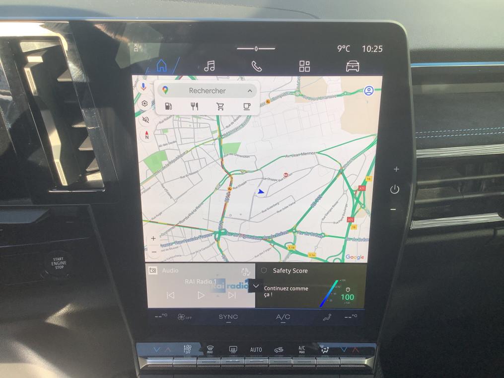 2 prises USB a l'AV et a l'AR, ABS avec aide au freinage d'urgence, Aide au freinage d'urgence, Aide au parking AV/AR et lateral, Airbags frontaux (conducteur et passager), Airbags lateraux bassin / thorax conducteur et passager AV, Airbags lateraux, milieu AV et rideaux, Alerte de distance de securite, Alerte detection de fatigue, Alerte franchissement de ligne et assistant maintien dans la voie, Appel d'urgence, Appuis-tete AV reglables, Banquette AR 1/3 2/3, Barres de toit longitudinales, Boite de vitesse automatique 4 rapports, Camera de recul, Carte Renault acces et demarrage mains libres, Chargeur smartphone a induction, Ciel de toit gris anthracite, Clignotants AR dynamiques, Climatisation automatique bi-zone, Commutation automatique des feux de route/croisement, Console centrale avec repose main coulissant, Controle dynamique de trajectoire ESC avec ASR, Detection intelligente des limitations de vitesse et prevention survitesse, Faux plancher de coffre, Feux AR a LED avec effet 3D, Feux AV full LED Adaptative Vision, Feux de jour a LED, Frein de parking electrique avec fonction Auto-Hold, Jantes alliage 20" Daytona diamantees noir, Kit de gonflage, Leve-vitres AR electriques a impulsion, Leve-vitres AV electriques a impulsion, Lumiere d'ambiance personnalisable, Miroir de surveillance enfants, Multi-sense, My Safety switch, Navigation Google Maps, Pack Design esprit Alpine exterieur, Pack Design esprit Alpine interieur, Palettes au volant, Pre-equipement alarme, Predisposition ethylotest, Regulateur de vitesse adaptatif, Retroviseur interieur electrochrome sans cadre, Retroviseurs exterieurs electriques, degivrants, rabattables automatiquement, Sellerie mixte tissu carbone / alcantara avec surpiqures bleues, Seuil de portes, Siege conducteur et passager avec reglage en hauteur, Sieges avec systeme ISOFIX, Systeme de surveillance de la pression des pneus, Systeme Multimedia openR link 12" : navigation, services Google, audio Arkamys Auditorium, Tableau de bord full numerique 12,3'', Verrouillage centralisee, Vitres AR surteintees, Volant reglable en hauteur et profondeur