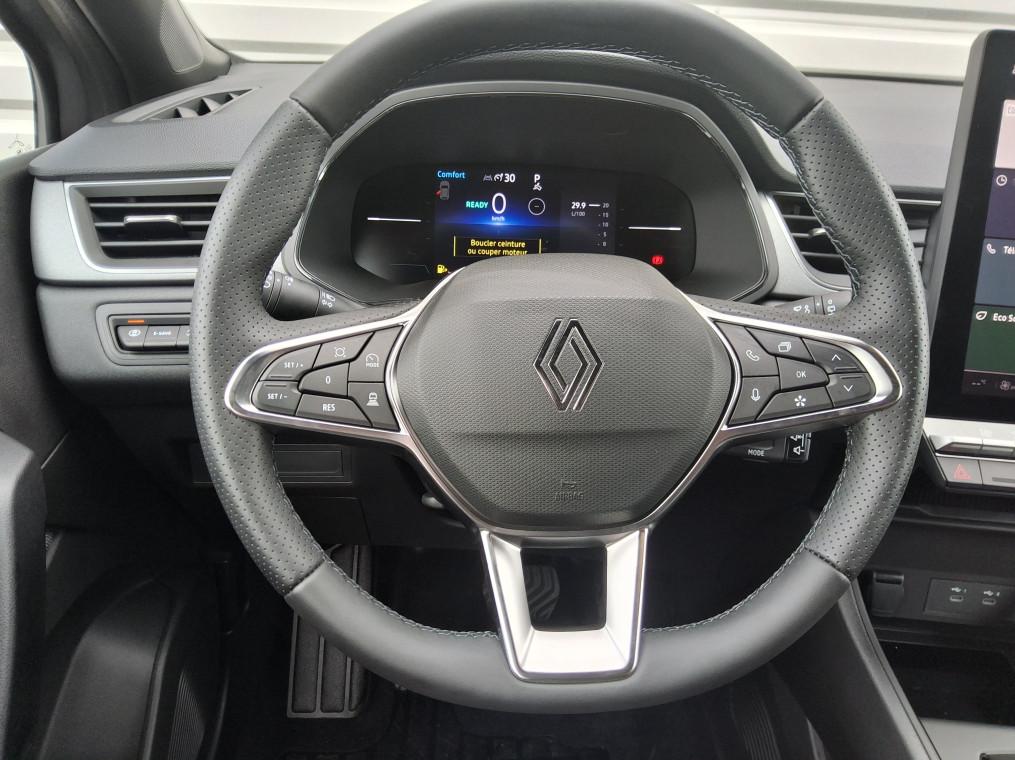 Aide au demarrage en cote, Aide au freinage d'urgence (A.F.U.), Aide au parking AR, Airbag passager deconnectable, Airbags frontaux, Airbags lateraux AV, Alerte detection de fatigue, Alerte distance de securite - Information dans tableau de bord, Alerte oubli des ceintures de securite aux 5 places, Alerte sortie de voie, Allumage automatique des essuie-glaces, Antenne requin, Antiblocage des roues ABS, Appel d'urgence, Appel d'Urgence Renault, Appuie-tetes AR, Banquette AR coulissante et rabattable 1/3 - 2/3, Boite de vitesse hybride multimode 6 rapports, Camera de recul, Carte Renault "Mains libres", Climatisation automatique, Condamnation centralisee des portes avec telecommande et condamnation des portes en roulant, Console centrale de rangement avec accoudoir, Controle de la traction (TCS), Controle dynamique de trajectoire ESC, Coques de retroviseurs noir/teinte caisse, Direction assistee, Eclairage AV et AR Full LED Pure Vision, Feux AR LED avec signature en forme de ''C'' et animation 3D, Feux de stop a LED, Frein de parking electrique avec fonction Auto-Hold, Harmonie noire, Indicateur de changement de vitesse, Jantes Aluminium 18'', Kit de gonflage et de reparation des pneumatiques, Leve-vitres electriques et impulsionnels, Liseuses AV a LED, Lunette AR chauffante, OpenR link 10,4 access display audio avec tableau de bord avec ecran numerique et personlisable 7", Plancher de coffre mobile, Poignees de portes ton caisse, Reconnaissance des panneaux de signalisation, Regulateur de vitesse adaptatif, Renault Multi-sense, Repetiteurs lateraux de changement de direction, Retroviseur interieur electrochrome, Sellerie Techno, Sieges AV reglables en hauteur, Systeme de detection de la pression des pneumatiques, Systeme de freinage d'urgence avance, Vitres AR surteintees, Volant textile enduit graine