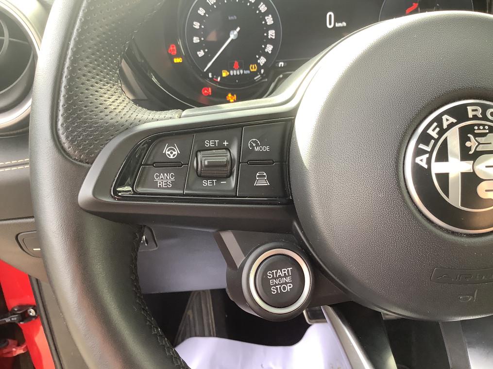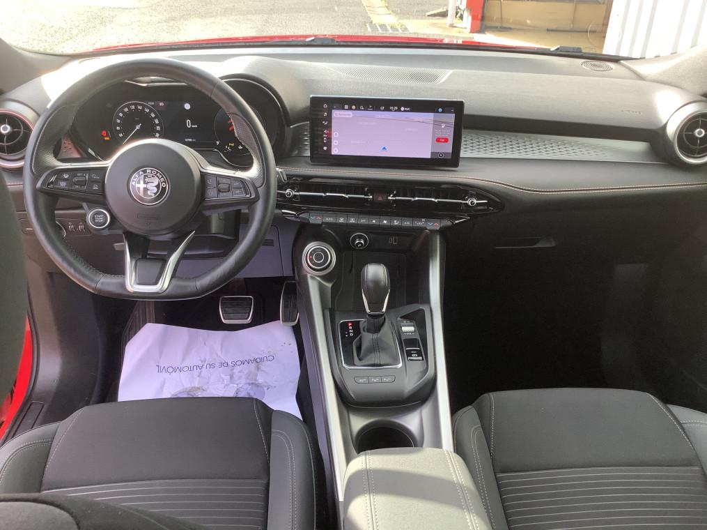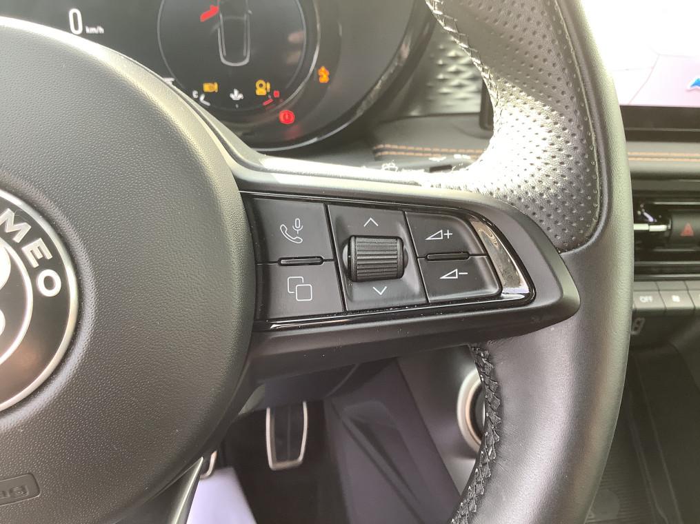 6 airbags (conducteur et passagers AV, lateraux, rideaux, genoux conducteur), ABS, ESP, TCS, Accoudoir AR, Accoudoir AV integre dans le tunnel central, Alerte de collision AV, Alerte de rappel de presence sur les sieges AR, Alfa Connect Services, Allumage automatique des feux et des essuie-glaces, Apple CarPlay / Android Auto sans fil, Assistant de maintien dans la voie, Assistant de vitesse intelligent (ISA), Banquette AR 60/40 avec trappe a ski, Boite automatique sequentiel 6 rapports, Camera de recul avec lignes dynamiques, Capteur de pression des pneumatiques TPMS, Ciel de toit sombre, Climatisation bi-zone automatique AV/AR, Combine d'instruments digital 12,3" Cannochiale, Coques de retroviseurs Noir brillant, Detection de fatigue du conducteur, Enjoliveurs de moyeux Alfa Romeo en blanc et noirs, Feux AR Full-Led, Frein de parking electrique, Freinage d'urgence autonome urbain, Jantes alliage 18" Ti avec pneumatiques ete A+, Dimensions: 235/50 R18, Jupes laterales noires, Kit anti-crevaison, Lame AV noir, Pedalier en aluminium, Projecteurs Full-Led avec signature lumineuse 3+3, Radar de stationnement AR, Radar de stationnement AV, Radio DAB, Regulateur de vitesse adaptatif intelligent avec lecture des panneaux couple avec navigation, Regulateur et limiteur de vitesse intelligent avec lecture des panneaux, Retroviseur interieur electrochrome, Retroviseurs exterieurs electriques et chauffants, Retroviseurs exterieurs rabattables electriquement, Scudetto noir, Selecteur de mode de conduite DNA (3 modes + ESC OFF), Sellerie AlfaTec/Tissu Carbonne, Sellerie Tissu Premium Logo "Biscione", Systeme audio a 6 HP, Systeme d'info-divertissement 10,2" tactile avec Navigation Europe, Systeme d'ouverture sans cle, Systeme de demarrage sans cle, Verrouillage centralise, Vitres AR privatives, Vitres AV/AR electriques avec fonction anti-pincement, Volant sport en cuir pleine fleur avec bouton de demarrage