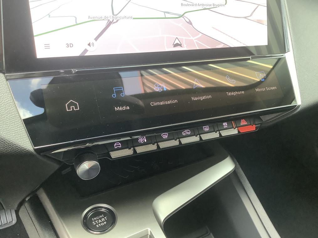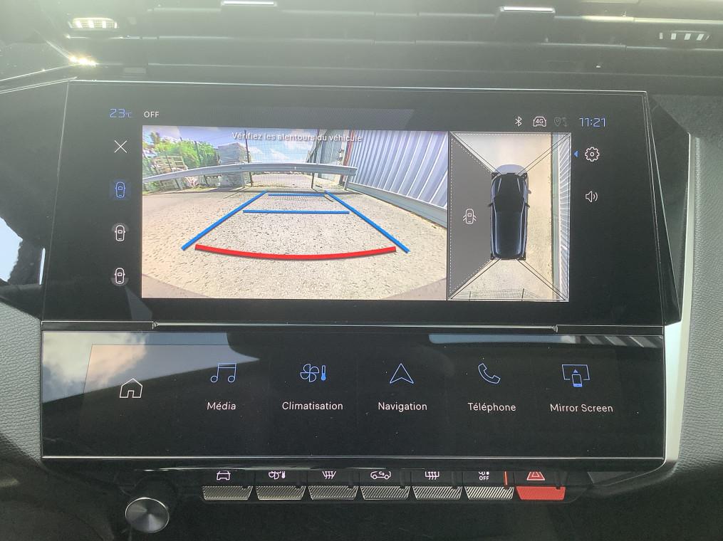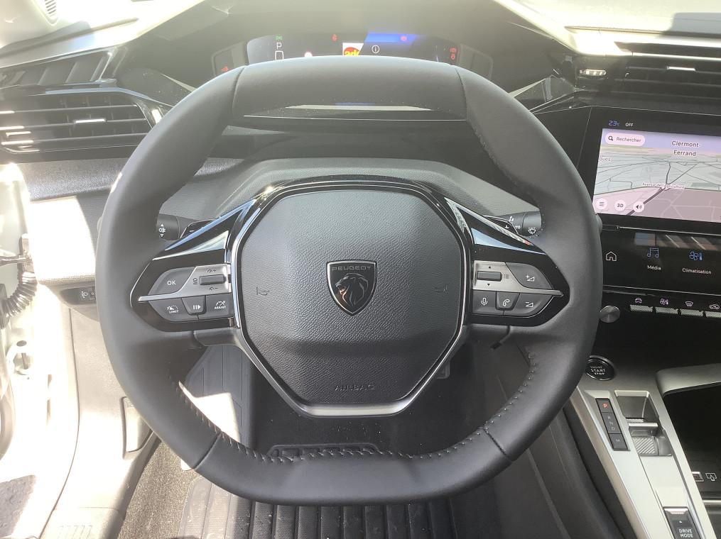 2 prises USB-C a l'AV, 2 telecommandes 3 boutons, 4 poignees de maintien, ABS, Accoudoir central AV avec compartiment de rangement, Active Safety Brake (freinage automatique d'urgence), Aide au stationnement AR, Aide au stationnement AV, Air conditionne automatique bi-zone, Air Quality System, Airbags frontaux conducteur et passager adaptatifs (passager neutralisable par cle), airbags, Alerte active de franchissement involontaire de ligne et bas cote, Alerte attention conducteur, Allumage automatique des feux de croisement, Bandeau entre feux AR Noir brillant, Banquette AR rabattable 1/3-2/3, Calandre AV Noir avec inserts chromes et ecopes Noir, Camera de recul, Commutation automatique des feux de route, Coques de retroviseurs exterieurs Noir Brillant, Demarrage mains libres, Diffuseurs d'air aux places AR, Ecran central tactile 10", ESP avec fonction Hill Assist (Aide au demarrage en pente), Essuie-vitre AV a declenchement automatique, Feux diurnes a LED sous projecteurs nouvelle signature Peugeot, Fonction Mirror Screen (Apple CarPlay/Android Auto) sans fil, Frein de stationnement electrique, Garnissage tri-matieres TEP/Tissu Falgo, surpiqures Bleu, Jantes alliage 17'' Calgary diamantees, Jupe AR Noir Brillant avec decors chromes, Lecheurs de vitres Noir Brillant, Leve-vitres electriques AV/ AR et sequentiels avec anti-pincement, Pack Drive Assist - Regulateur de vitesse adaptatif avec fonction Stop&Go : Regulateur de vitesse adaptatif avec fonction Stop&Go, Pack Safety Plus : Active Safety Brake pilote par camera et radar, Peugeot i-Cockpit avec combine d'instrumentation numerique 10'' personnalisable, Planche de bord avec jonc transversal peint et decor textile Texa, Projecteurs Peugeot LED, Reconnaissance etendue des panneaux de signalisation, Reglage lombaire du siege conducteur, Regulateur et limiteur de vitesse, Retroviseur interieur photosensible, Retroviseurs exterieurs avec eclairage d'approche, Retroviseurs exterieurs electriques, degivrants et rabattables electriquement, avec repetiteurs de, Selecteur mode de conduite Eco et Sport, Siege conducteur reglable en hauteur, Siege passager reglable en hauteur, Systeme stop & go couple avec l'assistance au positionnement sur la voie, Vitres AV electriques, Vitres laterales AR et lunette AR surteintees, Volant avec reglage manuel en hauteur et en profondeur, Volant croute de cuir
