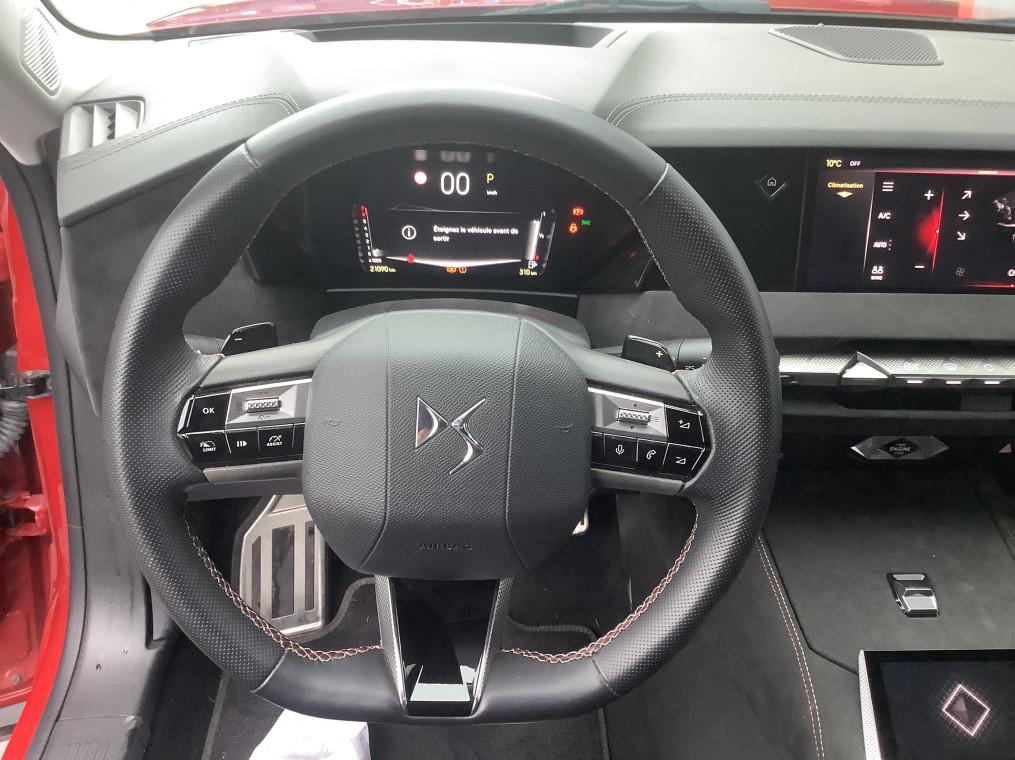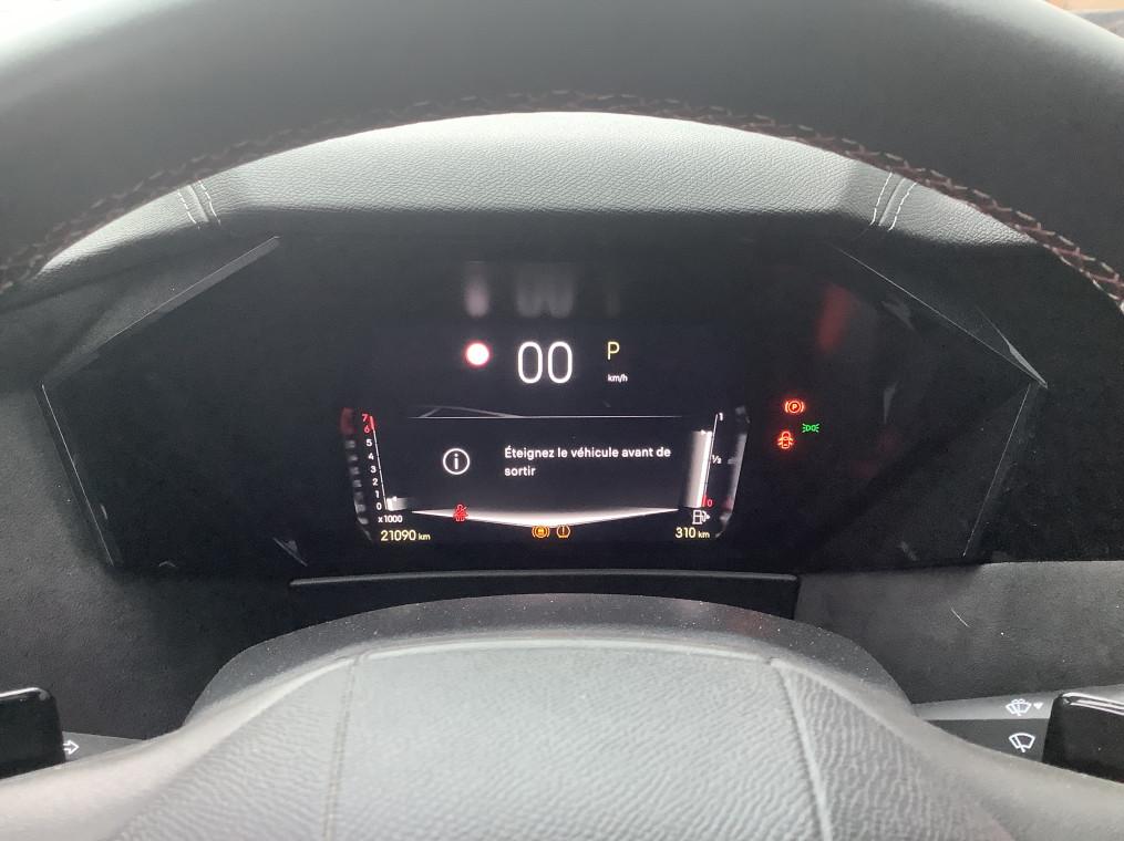 ABS avec repartiteur electronique de freinage (REF) et Aide au Freinage d'Urgence (AFU), Acces et demarrage mains libres Proximity, Accoudoir central AR avec trappe a ski et 2 porte-gobelets, Accoudoir central AV refrigere et eclaire, Adaptive Cruise Control Stop & Go, Aide au stationnement AV et AR et Camera de recul, Airbags frontaux (passager deconnectable), lateraux AV, rideaux aux places AV/AR et central, Alerte Attention Conducteur, Alerte de franchissement involontaire de ligne, Allumage automatique des feux, Antenne "aileron de requin", Avertisseur de risque de collision, Banquette AR 2/3 - 1/3 avec 3 appuie-tete, Banquette AR avec trappe a skis, Black Pack : DS Wings noir brillant, Jonc entre les feux AR noir brillant, Grille de calandre noir brillant, Lecheurs de vitres noir brillant, Boite a gants floquee, Cabochons d'ecrous de roue noir brillant, Capot actif, Climatisation automatique bi-zone, Combine numerique 7", Commutation automatique des feux, Condamnation automatique des portes et du coffre en roulant, Console centrale avec rangement ferme, Controle dynamique de stabilite (ESP) avec antipatinage des roues (ASR), Coques de retroviseurs exterieurs noir brillant, Demarrage mains-libres, Detection de sous-gonflage, Diffuseur AR noir brillant avec decors d'echappement chrome, DS AIR (Aerateurs centraux invisibles avec sabre chrome), DS E-Toggle (Selecteur de vitesses), DS EXTENDED HEAD UP DISPLAY, DS IRIS SYSTEM, DS SMART TOUCH, DS Wings noir brillant, Eclairage d'ambiance a LED, Eclairage de boite a gants, d'accoudoir central AV et de coffre a LED, Eclairage de cave a pieds a LED, Ecran tactile capacitif 10" HD, Enjoliveurs superieurs des vitres laterales noir brillant, Essuie-vitre AV a declenchement et cadencement automatiques, Feux AR Full LED effet 3D avec traitement ecailles, Fixations ISOFIX a la place passager AV et aux places laterales AR, Frein de stationnement electrique automatique, Freinage d'urgence automatique pilote par camera et radar, Freinage multi-collision, Grille de calandre noir brillant, Interieur Alcantara Noir : Planche de bord en alcantara, Decors de panneaux de porte Chrome guilloche, Console centrale en alcantara, Sellerie en Tissu Tresse Basalte avec Alcantara et toile DS, Panneaux de portes en alcantara, Volant en cuir fleur Mistral avec surpiqures, Ciel de pavillon clair, Jantes alliage 19" MINNEAPOLIS, Jonc de volet noir brillant, Kit de depannage provisoire de pneumatiques, Lecheurs de vitres laterales et enjoliveur de custode noir brillant, Leve-vitres AV/AR electriques, sequentiels et antipincement, Lunette AR chauffante, Mirror Screen sans fil via Wifi, Monogramme AR noir brillant, Monogramme AV noir mat, Monogramme DS chrome sur l'enjoliveur de custode lateral noir brillant, Monogramme exterieur sur le capot noir brillant, Pack Sieges mecaniques avec reglages lombaires conducteur et passager, Palettes au volant, Pare-brise teinte acoustique, Pare-soleil avec miroirs de courtoisie occultables eclaires a LED, Pedalier en aluminium, Plafonnier I-Dome, Poignees exterieures affleurantes chromees, Preconditionnement thermique de l'habitacle programmable par smartphone, Predisposition pour roue de secours galette, Prises 12 V, Prises USB, Projecteurs a LED, Radio numerique terrestre (DAB), Reconnaissance des panneaux de vitesse et preconisation, Reconnaissance etendue des panneaux de circulation, Regulateur/Limiteur de vitesse, Retroviseur interieur electrochrome sans cadre, Retroviseurs exterieurs electriques, degivrants, rabattables electriquement, Seuil de coffre aluminium, Seuil de portes AV specifiques, SOS & Assistance, Surtapis AV/AR, Teinte Caisse nacree, Teinte Caisse nacree Noir Perla Nera, Verins d'ouverture et de maintien du capot moteur, Vitres AR et lunette AR surteintees, Volant reglable en hauteur et profondeur