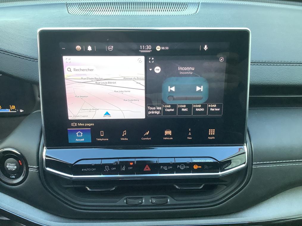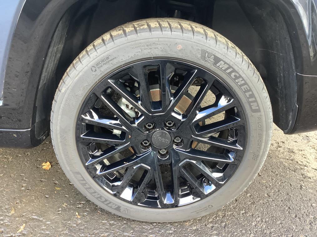 Accoudoir central AR avec porte-gobelets, Accoudoir central AR avec porte-gobelets, Aide au stationnement AR ""Park Sense"", Aide au stationnement AV, Airbags frontaux, lateraux de type rideau avec airbag passager neutralisable, Alarme périmétrique, Apple CarPlay / Android Auto, Banquette AR 60/40 rabattable a plat, Banquette AR rabattable 40/20/40 a plat, Barres de toit longitudinales, Bas de caisse couleur carrosserie, Bas de caisse Gloss Black, Bluetooth, Camera de recul Parkview avec affichage dynamique, Capteur de luminosite (allumage des feux automatique), Chargeur sans-fil pour smartphone, Climatisation automatique bi-zone avec aérateur aux places AR, Combine d'instrumentation numerique configurable a ecran TFT de 10,25"", Commandes audio au volant, Condamnation automatique des portes en roulant, Detecteur de somnolence, Enter-N-Go : systeme d'ouverture et de demarrage sans cle, Essuie-glace vitre AR, Essuie-glaces automatiques (capteurs de pluie), Feux antibrouillard LED, Feux LED avec signature specifique, Frein de stationnement electrique avec aide au demarrage en cote, Freinage autonome d'urgence avec detection pietons et cyclistes, Hayon electrique mains-libre, Jantes en alliage Gloss Black 19"" 235/45 R19 Pneumatiques 3 saisons, Jeep Wave - programme de fidelite premium avec 2 ans d'entretien, Limiteur de vitesse intelligent, Navigation GPS avec informations sur les panneaux de signalisation, Prise 12V a l'AR et dans le coffre, Prise de courant auxiliaire 230V, prise USB type A et C, Prises USB type A et C, Projecteurs antibrouillard AV à LED, Projecteurs AR a Signature LED, Radar de recul, Radio DAB , Regulateur de vitesse adaptatif avec fonction Stop&Go, Retroviseur interieur photochromique, Retroviseurs exterieurs degivrants, reglables et rabattables electriquement, Sellerie en Cuir, Siege conducteur a reglage lombaire electrique 4 positions, Siege conducteur et passager a reglage manuel 6 positions, Smartbeam : commutation automatique feux de route/feux de croisement, Start & Stop, Systeme anti-louveoiment en conditions de tractage, Systeme anticollision actif, Systeme audio 6 HP, Systeme audio Uconnect, Systeme d'affichage de la pression des pneus, Systeme d'avertissement de franchissement de ligne avec correction, Systeme d'infodivertissement ""UConnect 5"" a ecran tactile 10,1"", Systeme de reconnaissance des panneaux de signalisation, Systeme preventif anti retournement (ERM), Toit noir, Trappe de carburant a verrouillage electrique, Uconnect Service, Vitres et lunette AR surteintees"